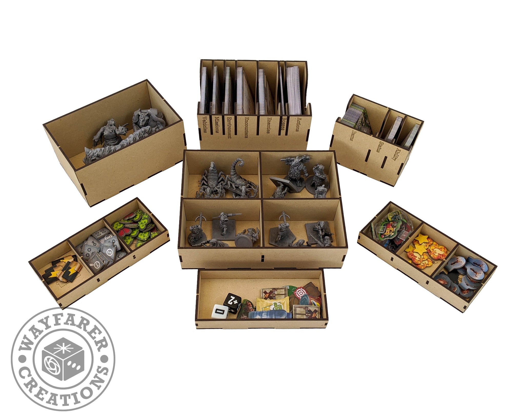 This unofficial laser-cut MDF organizer is designed to hold the Plaid Hat Aftermath Board Game. It has space to hold the game components and keep everything separated and protected between sessions. When assembled, it consists of 7 individual containers. This organizer is a great way to keep your pieces organized so you can save time and play more.