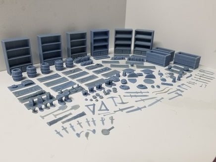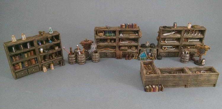 The General Store Goods includes everything pictured. (The painted picture is for reference only). It has 2 different display shelves and a display case. There are shelf inserts with a wide variety of ready to go goods that can be placed on the shelves or in the case, as well as a blank shelf just in case you want to add your own items. There are also a ton of stand alone items that can be placed anywhere, or used in your dungeons. Some pieces very delicate and are printed as half Items and should be assembled with 405nm resin as a glue agent.