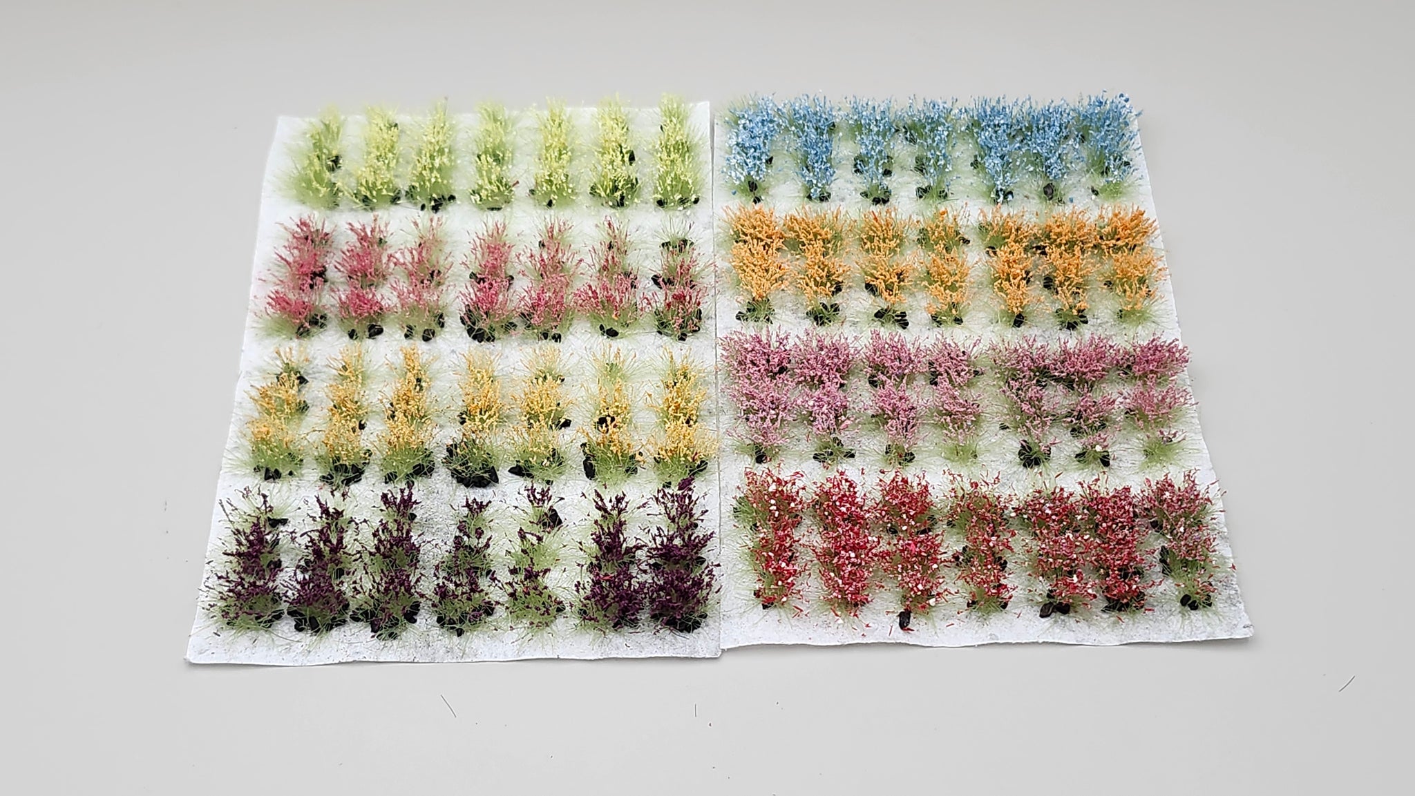 Flower Samplers: Containing two sheets of tufts that have 168 total tufts per pack in small, medium, and large size that are roughly 4, 6, and 9mm diameter at the base. These samplers each contain 8 different flower colors.