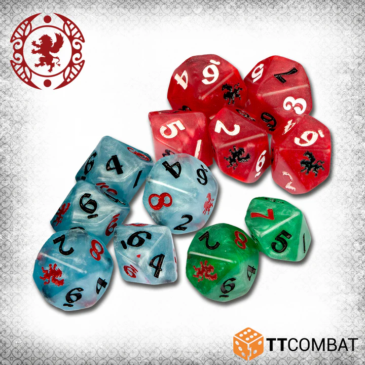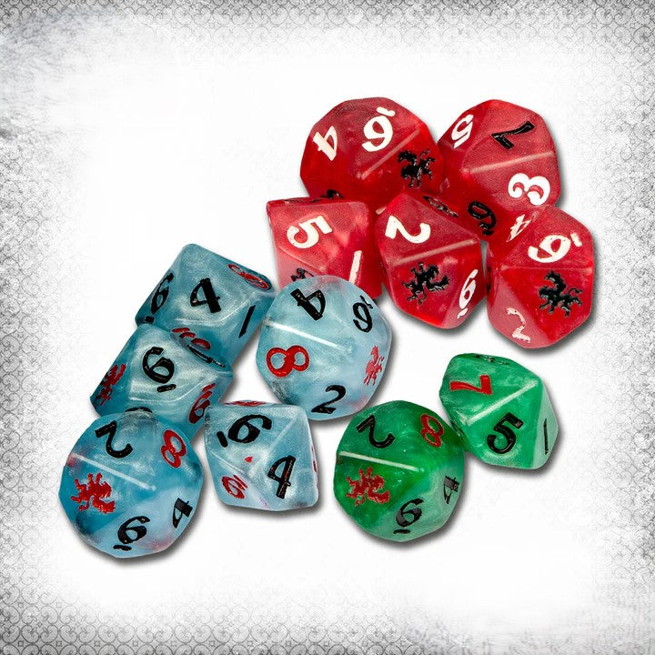 If that's you, then these Quick Play Dice answer your call for aid. This pack contains 12 ten-sided dice; 5 in red (for Life Points, 5 in blue (for Will Points), and 2 in green (for those elusive Command Points). Each number is delicately etched on, with the Carnevale lion taking the place of the 10. Not only that, but the 7, 8, 9 and lion are filled in a complementary colour, making spotting Aces easier than ever!
