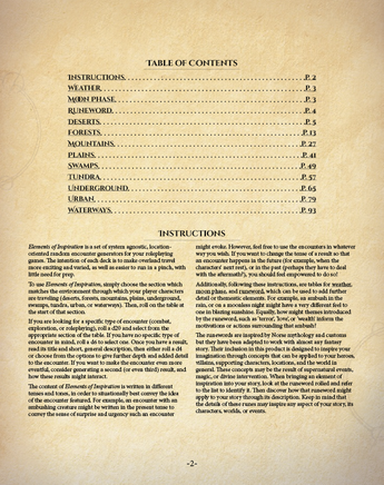 This 420-card box set contains 9 tarot-sized card decks of exploration, roleplay, and combat encounter cues, each for a different environment, for fantasy roleplaying games, writers, and storytellers.