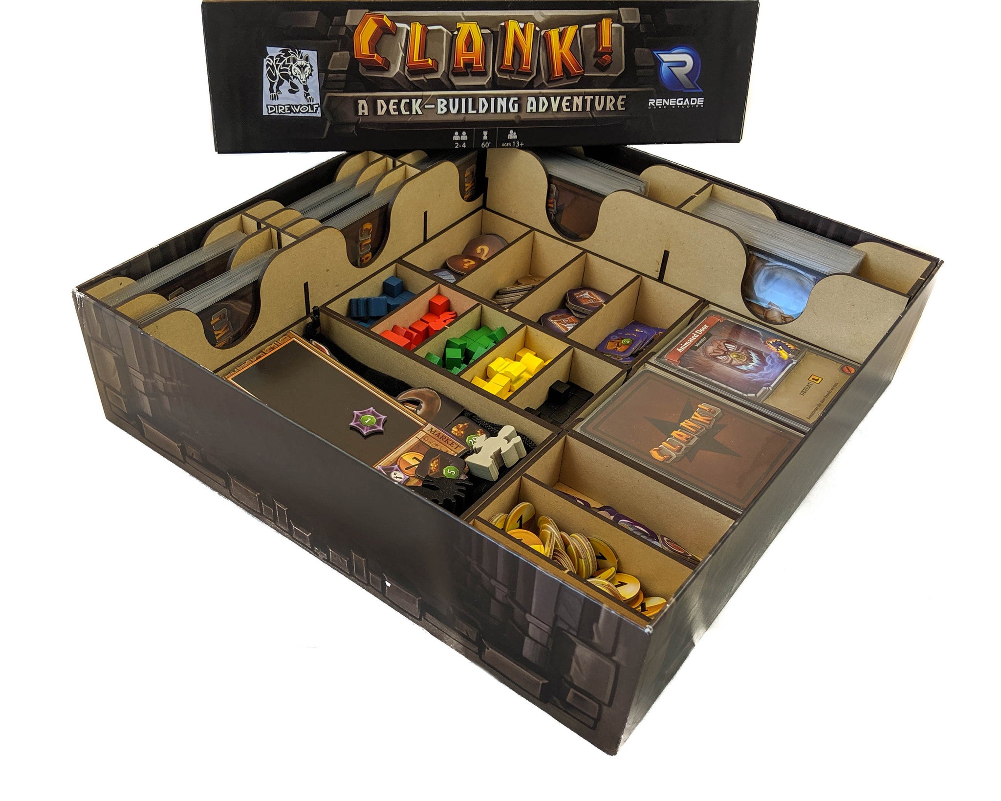 Sneaking through dungeons looking for loot without clanking is hard enough, finding your game pieces shouldn’t be! This unofficial laser-cut MDF organizer is designed to hold the original Clank! along with the Sunken Treasure, Mummy’s Curse, and Gold and Silk expansions in the original game box. The organizer features spaces to keep all the game tokens divided by type and areas for each of the colored cubes. Along the sides are spaces for all of your cards (will fit sleeved cards) with special areas for all of the starting and expansion cards separated for easy sorting. All of this fits in the original game box without adding any uplift to the lid.