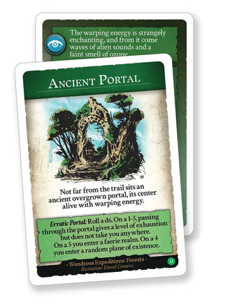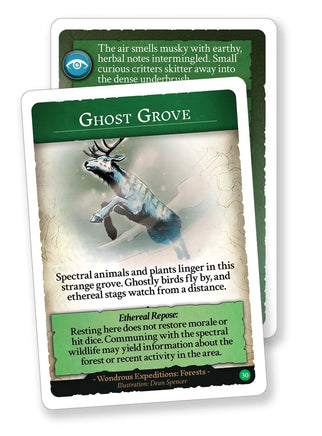 The Wondrous Expeditions: Forests card deck is a helpful tool for roleplaying game masters to keep wilderness travel exciting. Each card offers a unique location with a special property on the front, and five "senses" descriptions on the back, that sometimes double as story hooks. With just the flip of a card, you will keep the adventure going at all times by seemingly unrivaled improvisation skill! Sshhhh don't tell your players!