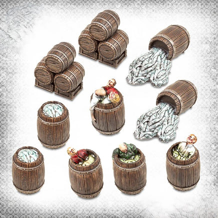 This set contains 2 fish barrels, 2 fallen fish barrels, 2 barrel stacks, and 4 corpse barrels (1 each of 4 designs). They're great for decorating your board, and also make perfect Obstacles for jumping off in your games of Carnevale. Just don't slip over!
