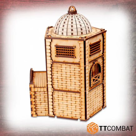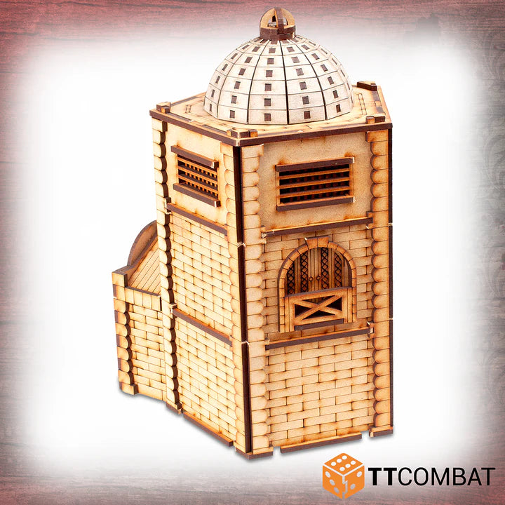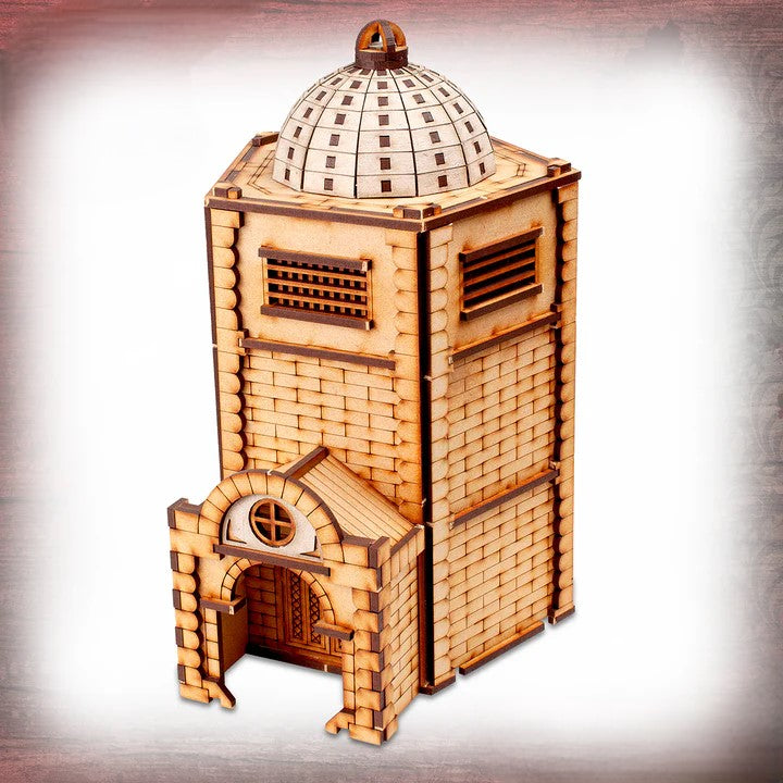 This kit is made from 3mm MDF and 1mm Greyboard and has been designed for Carnevale, using multiple storeys to climb and jump, and roofs at easy angles so that miniatures will not fall off when darting across the Venetian skyline. It is a great piece of scenery to use with other 28-32mm games.