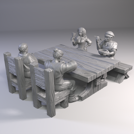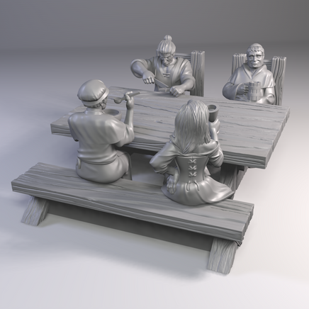 Consists of: 1 Table w/ food, 1 Table wo/ food, 1 Benches, 2 Chairs, 4 Miniatures Seated.