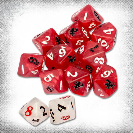 This pack contains 12 ten-sided dice; 10 in The Guild red, and 2 Destiny dice in white. Each number is delicately etched on, with the Carnevale lion taking the place of the 10. Not only that, but the 7, 8, 9 and lion are filled in a complementary colour, making spotting Aces easier than ever!