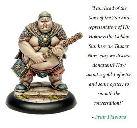 Contains: 1x Friar Flavious Miniature, Stat Card and Base, in a blister pack.