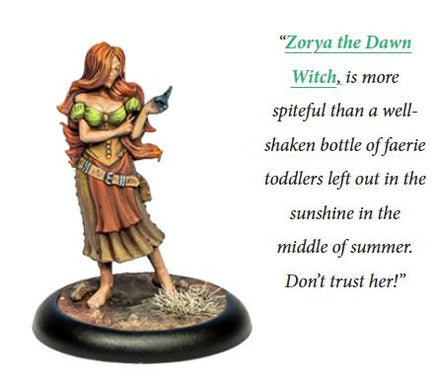 Contains: 1x Zorya Dawn Witch Miniature, Stat Card and Base, in a blister pack.
