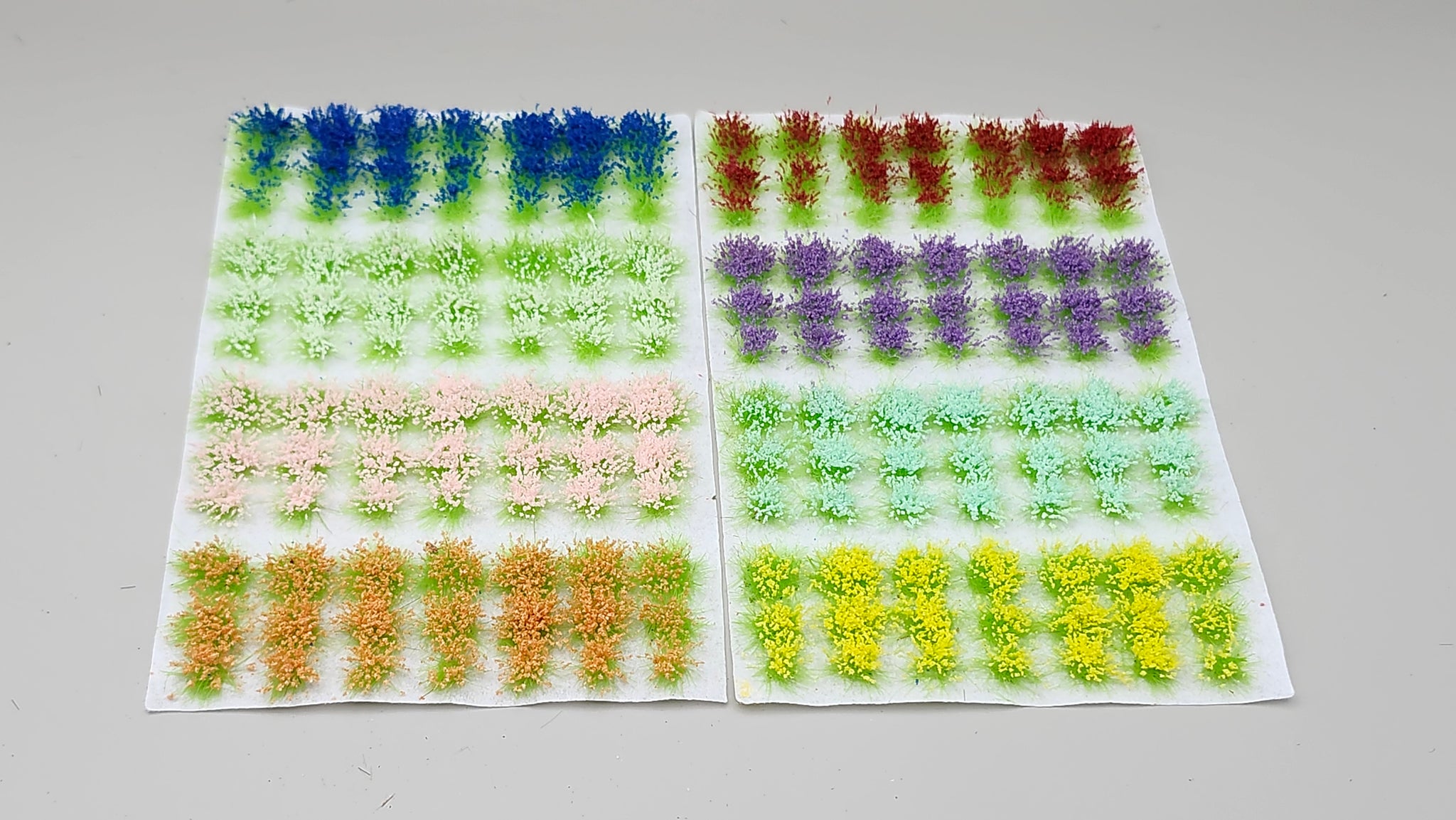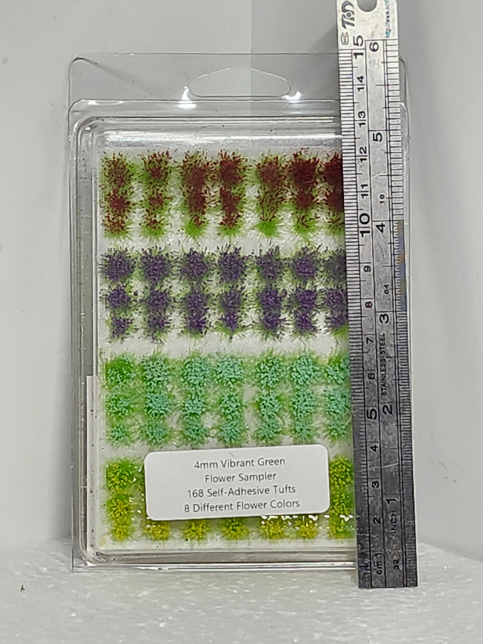 Flower Samplers: Containing two sheets of tufts that have 168 total tufts per pack in small, medium, and large size that are roughly 4, 6, and 9mm diameter at the base. These samplers each contain 8 different flower colors.